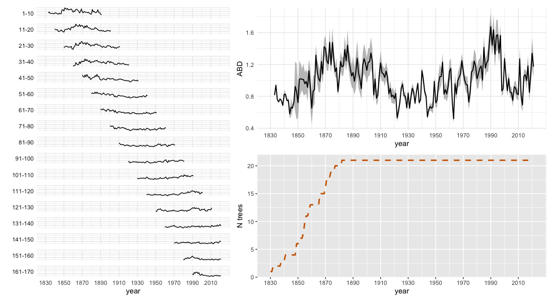 plotABD(inData, min_nTrees_year = 1)The resulting multi-panel plot displays: