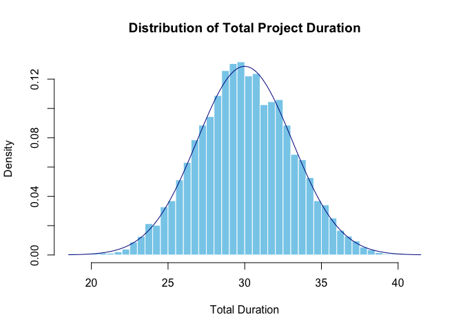 This will give you a visual representation of the uncertainty in the total project duration based on the individual task distributions. On average, the project is expected to take around 30 time units, but could take as little as 20 or as much as 40 time units.
