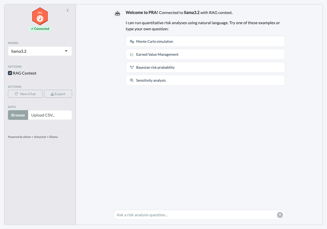 PRA can be used as a traditional R package with direct function calls, or as an AI-powered risk analysis agent with three input modes: