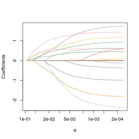 fit <- SLOPE(heart$x, heart$y, family = "binomial")We can plot the resulting regularization path: