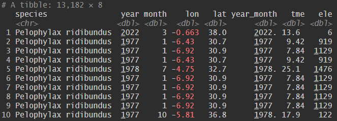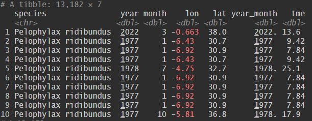 SppTrend.The following is an example using ranidae example from GBIF and selected in the exted (lon: -10 >= record <= 10 & lat: -40 >= record <= 40) and in dates (year >= 1950).