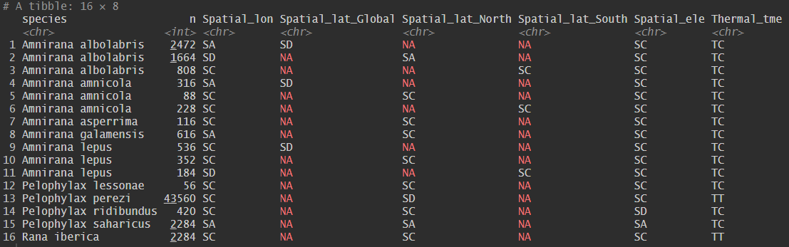 WARNING: Species Rana temporaria has insufficient data (n = 1 and < n_min = 10) in North hemisphere.