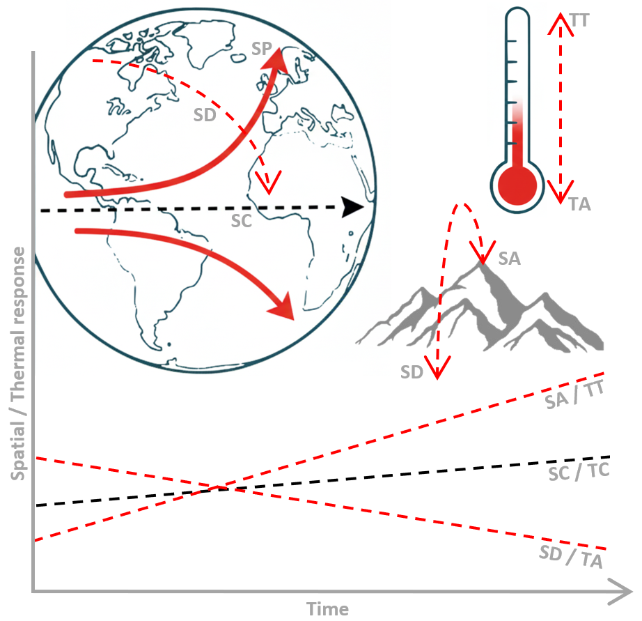 Spatial Adaptation (SA): A significant positive temporal trend in the spatial position of species occurrences. In the context of climate change, this pattern is commonly associated with a poleward shift, corresponding to a northward displacement (towards higher latitude values) in the Northern Hemisphere and southward displacement (towards lower latitude values) in the Southern Hemisphere, as species expand into newly suitable areas.