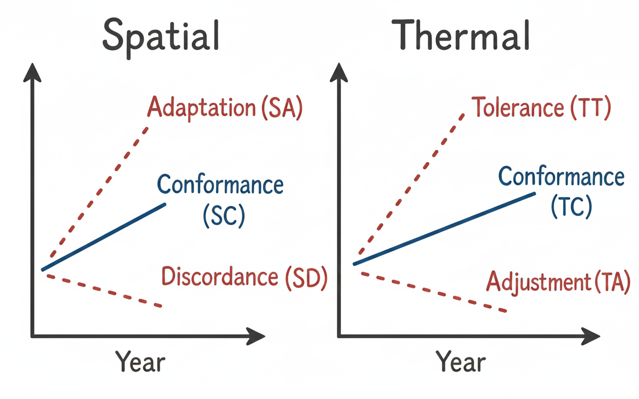 Thermal Adjustment (TA): A thermal response characterised by a significant negative temporal trend in the temperature conditions associated with species occurrences, relative to the overall trend. This indicates and increasing association with cooler temperature conditions over time, potentially reflecting microevolutionary change or phenotypic adjustment.