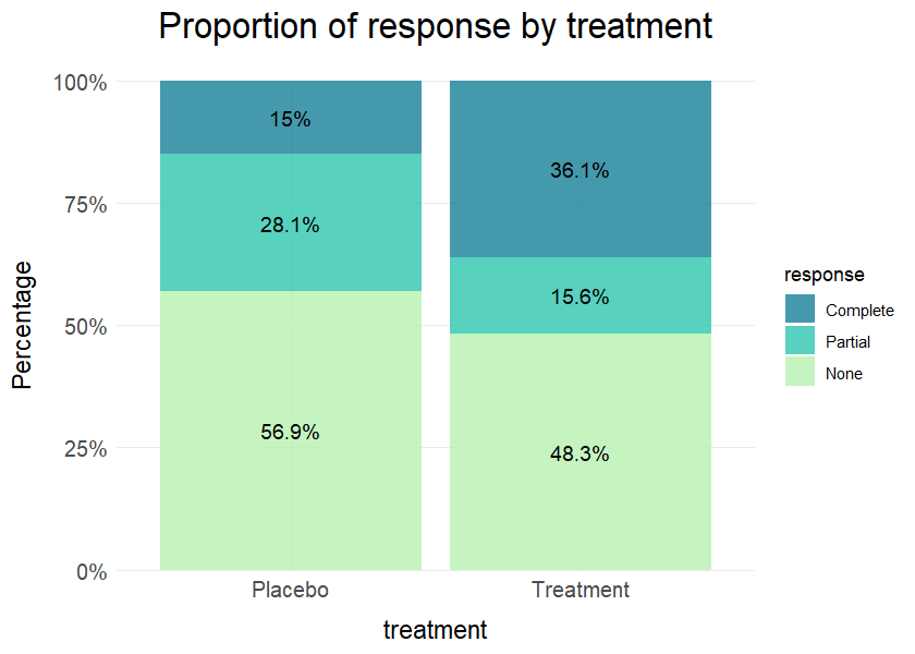 plot_bar(data = clinical_df, x = "treatment", group = "response", position = "fill",