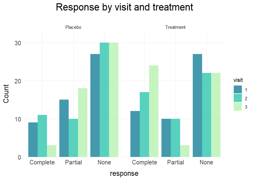 plot_bar(data = clinical_df, x = "response", group = "visit", facet = "treatment",