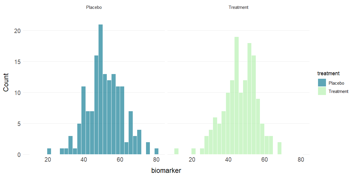 plot_hist(clinical_df, x = "biomarker", group = "treatment", stat = "mean")