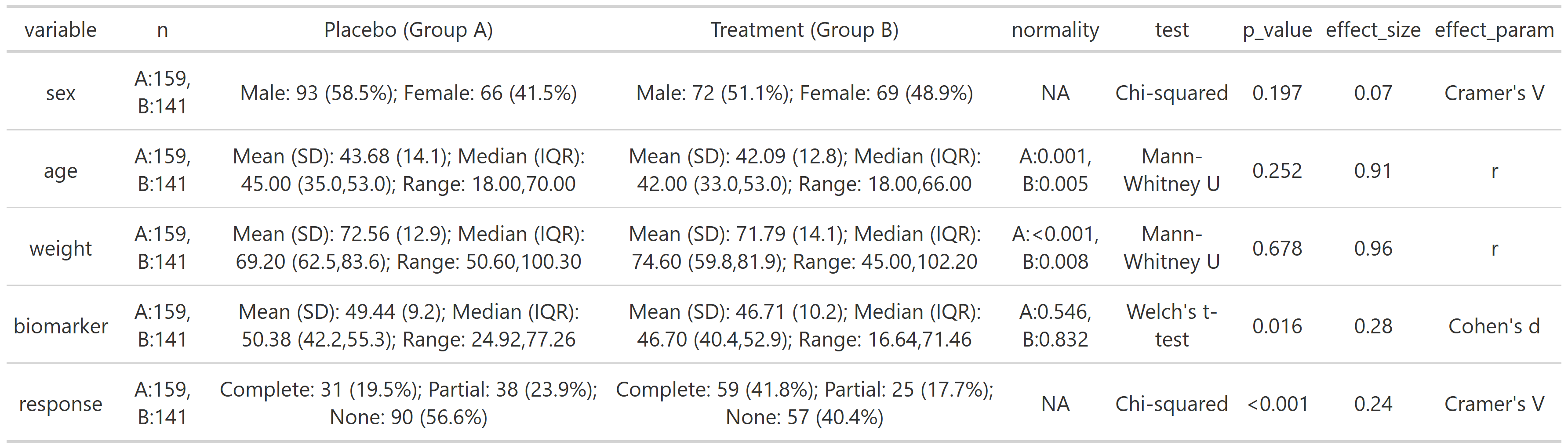 #> 20 002 10 Female B 72 NA NA <NA>Generates a summary table for biostatistics and clinical data analysis with automatic normality, effect size, and statistical test calculations. Handles both numeric and categorical variables, performing appropriate descriptive statistics and inferential tests for single-group summaries or two-group comparisons.