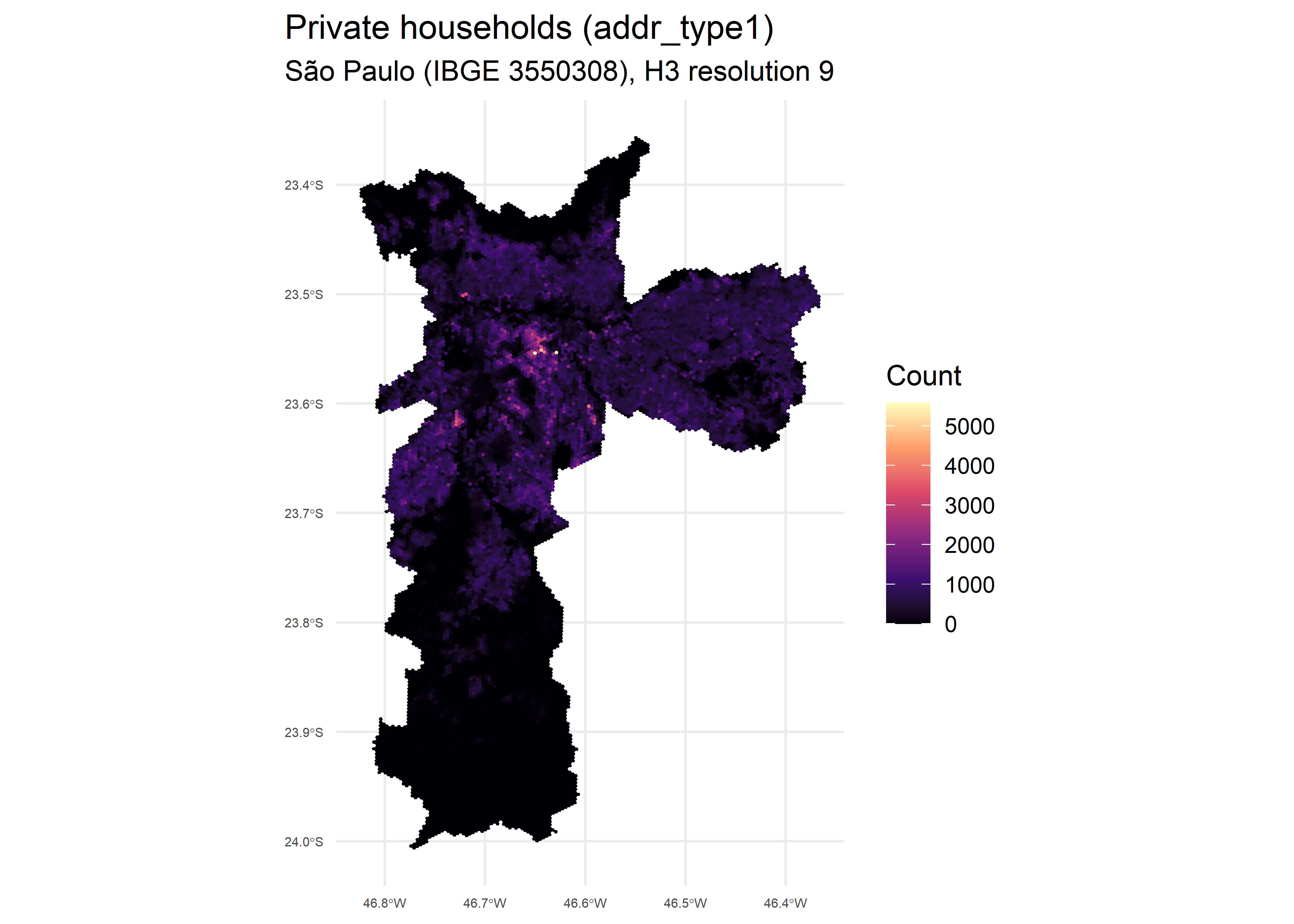 Below is an example using H3 hexagons for São Paulo at resolution 9: