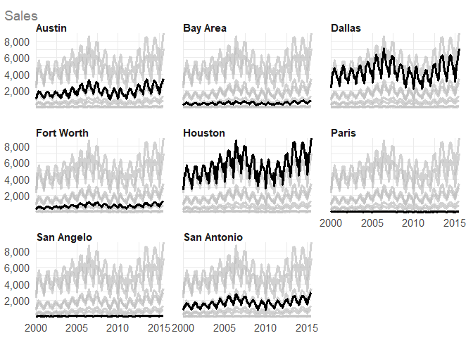 If you have more than 6 categories, the plot type changes to a faceted line chart, with one category highlighted on each facet: