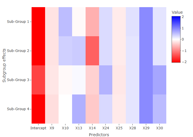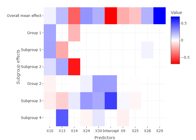)By specifying the type = “coefficients”, we plot all non-zero coefficient including the overall mean, group-specific, and subgroup specific.