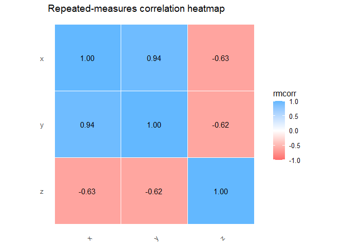 (rmcorr()); agreement tools cover Bland-Altman (two-method