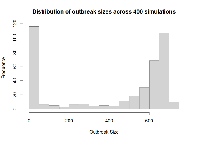 main = "Distribution of outbreak sizes across 400 simulations",