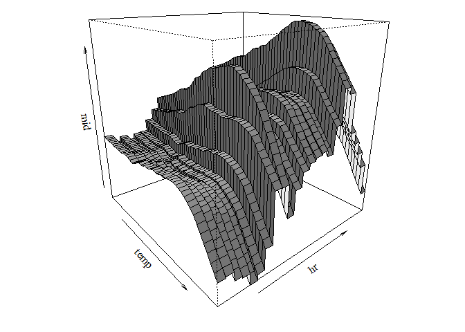 persp(mid_tune$fit, "temp:hr", theta = 50, phi = 20, shade = .5)