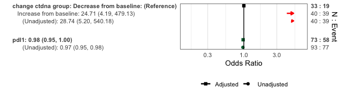 covs=c('age','pdl1','change_ctdna_group'))| OR(95%CI) | p-value | N | Event | |