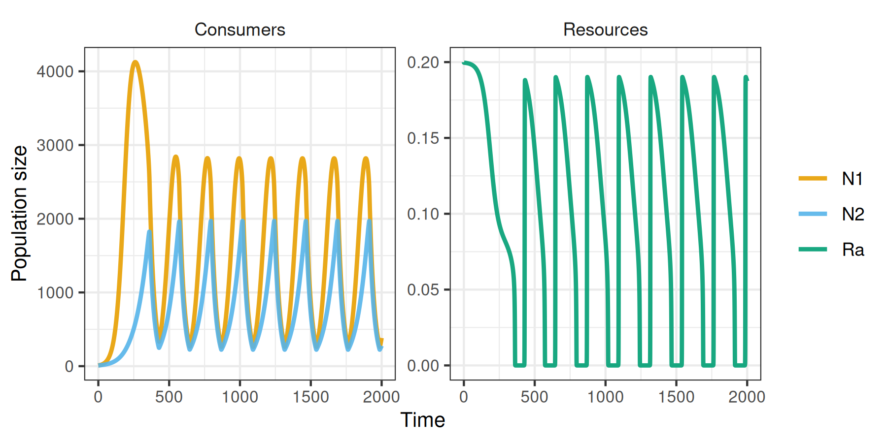 The following two examples demonstrate how to build and simulate a model for: i) two consumers with type II functional responses on a single logistically growing resources; and ii) two consumers with type III functional responses with pulsed resources and time dependent growth parameters. A wide range of other examples can be found in the package vignettes.