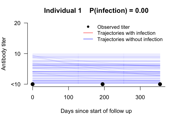 Red lines show posterior trajectories with infection; blue lines show trajectories without infection. Black dots are observed HAI titers.