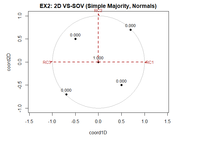 vs_sov_user()Examples 2-4 expand the space to two dimensions (2D) using 5 voters and 3 roll calls. They illustrate the use of simple versus absolute majority rule (EX2 and EX4), the use of midpoints in place of normal vectors (EX2 and EX3), and a supermajority rule (EX4).