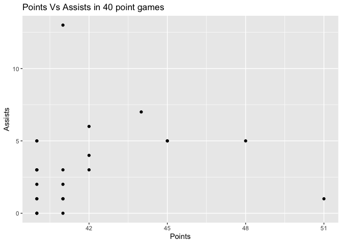 labs(title = "Points Vs Assists in 40 point games", x = "Points",y = "Assists")