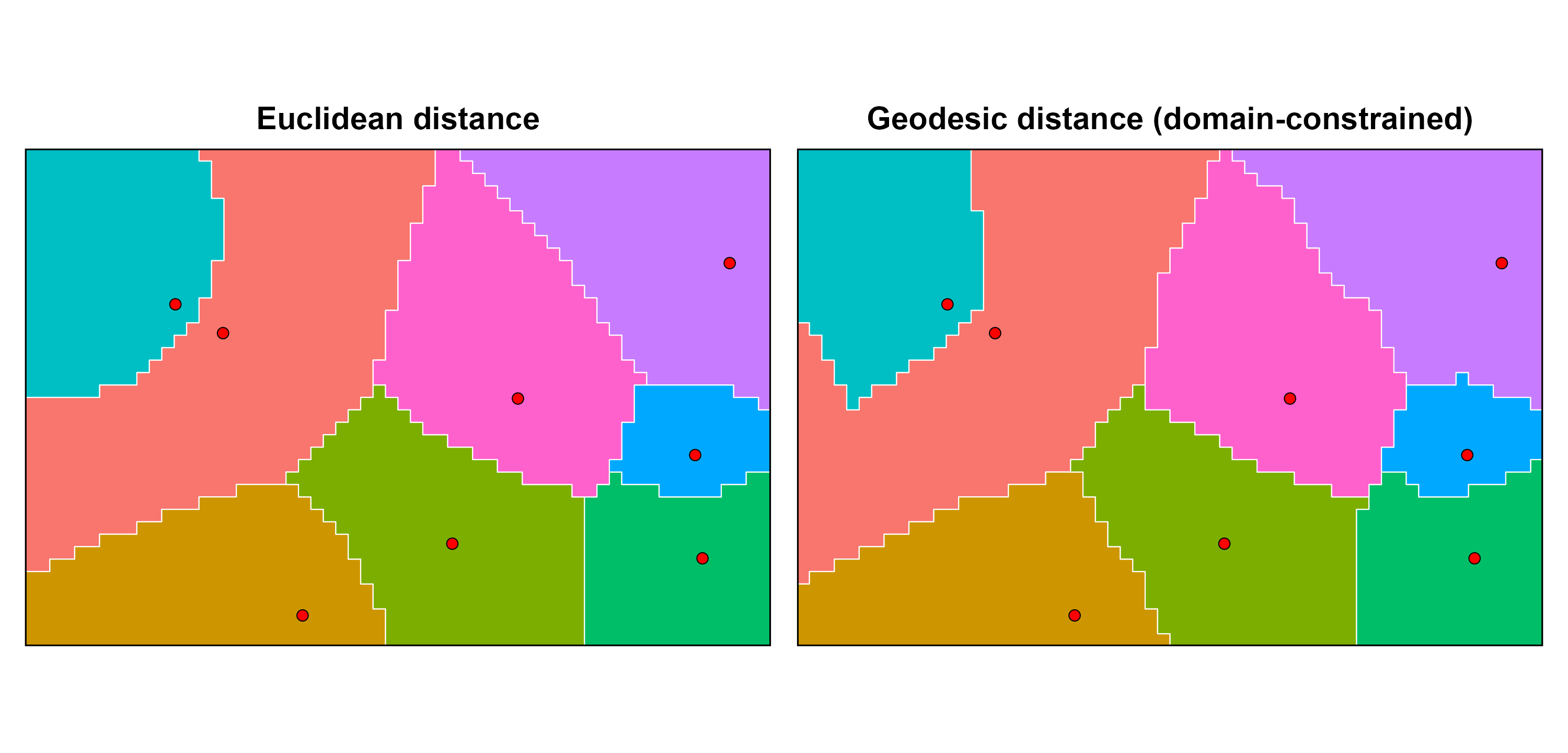 weightedVoronoi generates weighted spatial partitions that respect boundaries, landscape structure, and heterogeneous point influence using Euclidean or geodesic distance.
