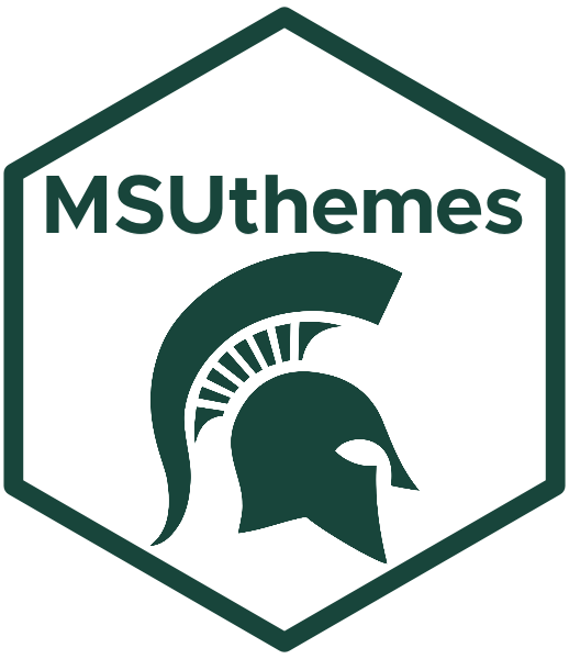 This package is inspired by the RSSthemes package and based on the work of Andreas Krause, Nicola Rennie, and Brian Tarran. While the original RSSthemes package focused on the Royal Statistical Society (RSS) branding, this package adapts the concepts to fit MSU’s visual identity. The MSUthemes package uses the RSSthemes framework, replaces the RSS colour palettes and font with MSU colour palettes and font, respectively, and adds comprehensive Big Ten Conference institutional colours with reliable institution-to-colour matching capabilities.