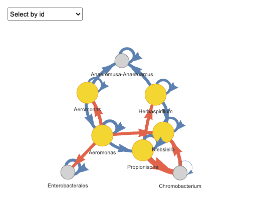 Please note that the output is an interactive HTML chart supporting zooming and dragging for detailed exploration. However, since interactive htmlwidgets cannot be rendered here, users can do it for your own. In the chart, arrow colors indicate interaction types: orange represents positive interactions, and blue represents negative interactions. Nodes represent species, with keystone species (i.e., those involved in multiple pairwise interactions) highlighted in yellow.