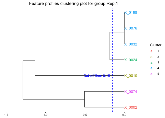 We can also identify the optimal clusters of microbial features based on the clustering results. Here we select features with correlation distance less than 0.15 for clustering.