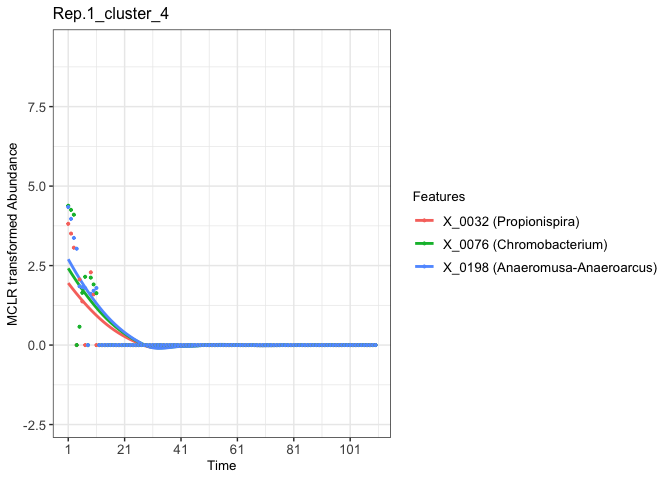 Finally, we can visualize the abundance patterns of microbial features within each selected cluster.