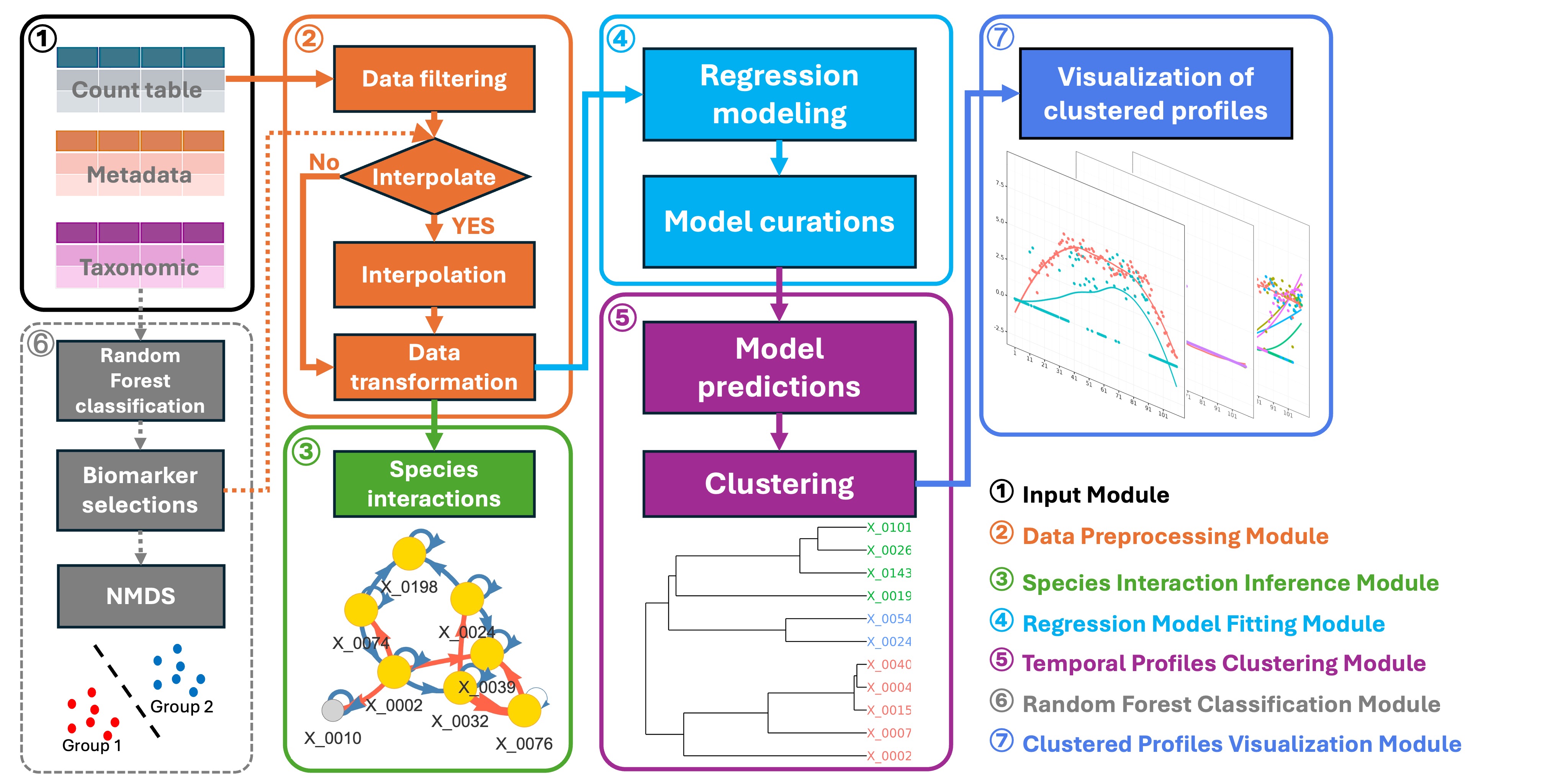 Based on the fitted regression models, we can predict the temporal abundance patterns of each microbial feature. These features can then be clustered according to the similarity of their abundance temporal patterns, using correlation distance as the clustering metric.