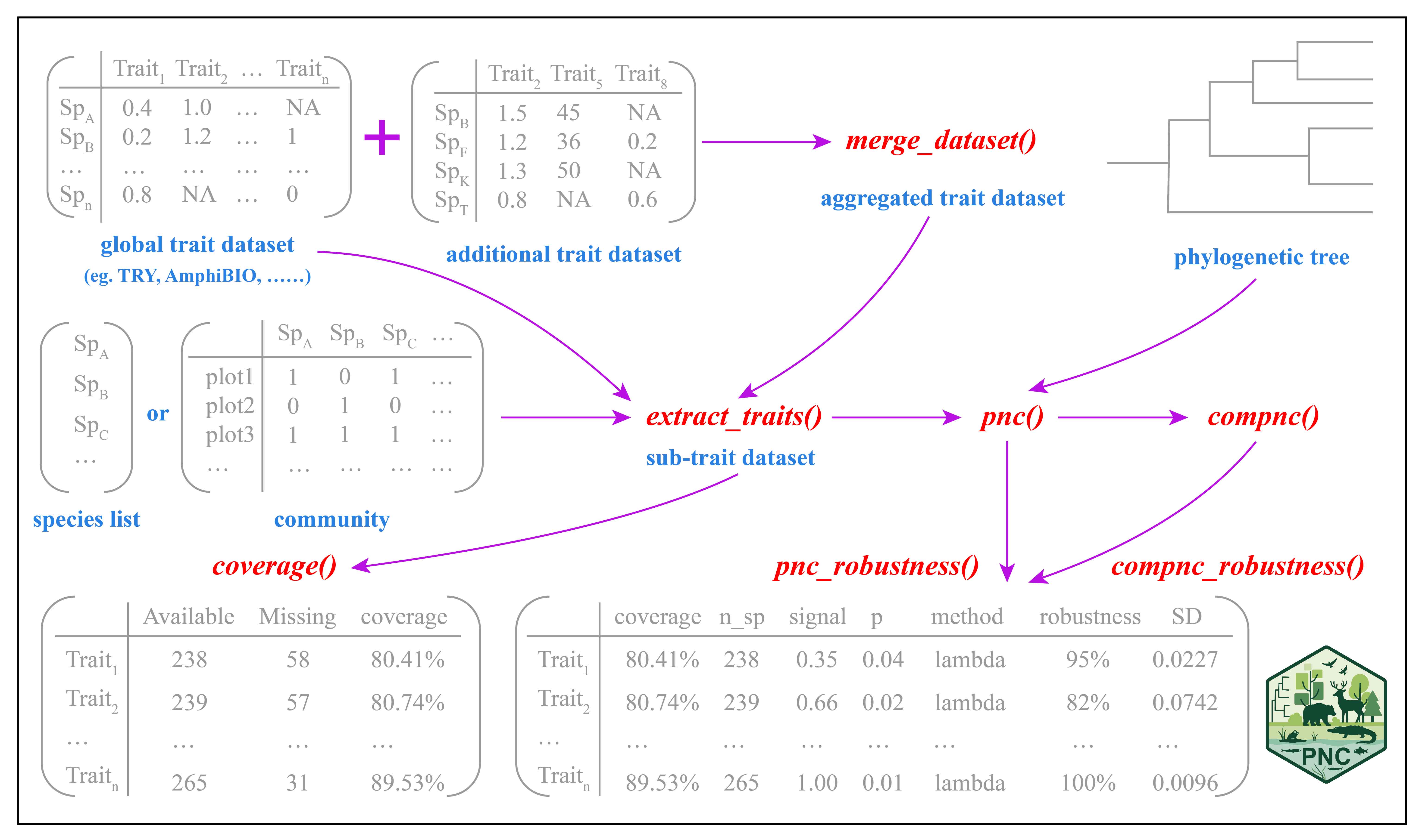 The PNC package is an open-source, all-in-one solution for empirically testing the key assumption of phylogenetic niche conservatism (PNC) in ecological community studies. Designed for accessibility and scientific rigor, PNC streamlines the entire workflow—from integrating comprehensive, global trait databases (covering plants, birds, mammals, reptiles, amphibians, and fish) to assessing data quality, performing dimensionality reduction, and batch processing analyses.