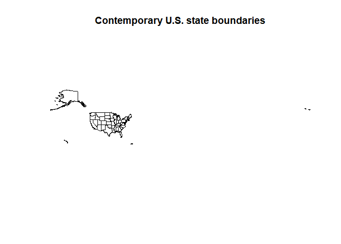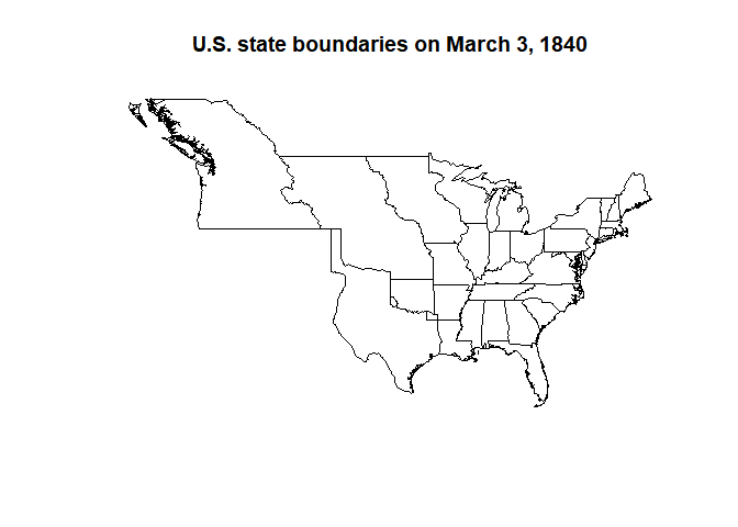 This R package includes contemporary state, county, and Congressional district boundaries, and zip code tabulation area centroids. It also includes historical boundaries from 1629 to 2000 for states and counties from the Newberry Library’s Atlas of Historical County Boundaries and historical city population data from Erik Steiner’s “United States Historical City Populations, 1790-2010.”