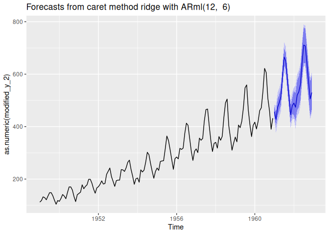 fit <- ARml(AirPassengers, max_lag = 12, caret_method = "ridge",