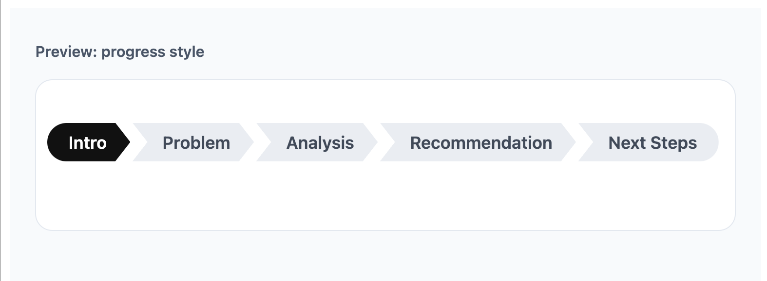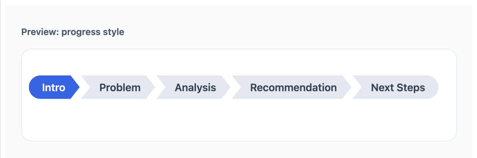 sections = c("Intro", "Problem", "Analysis", "Recommendation", "Next Steps"),
