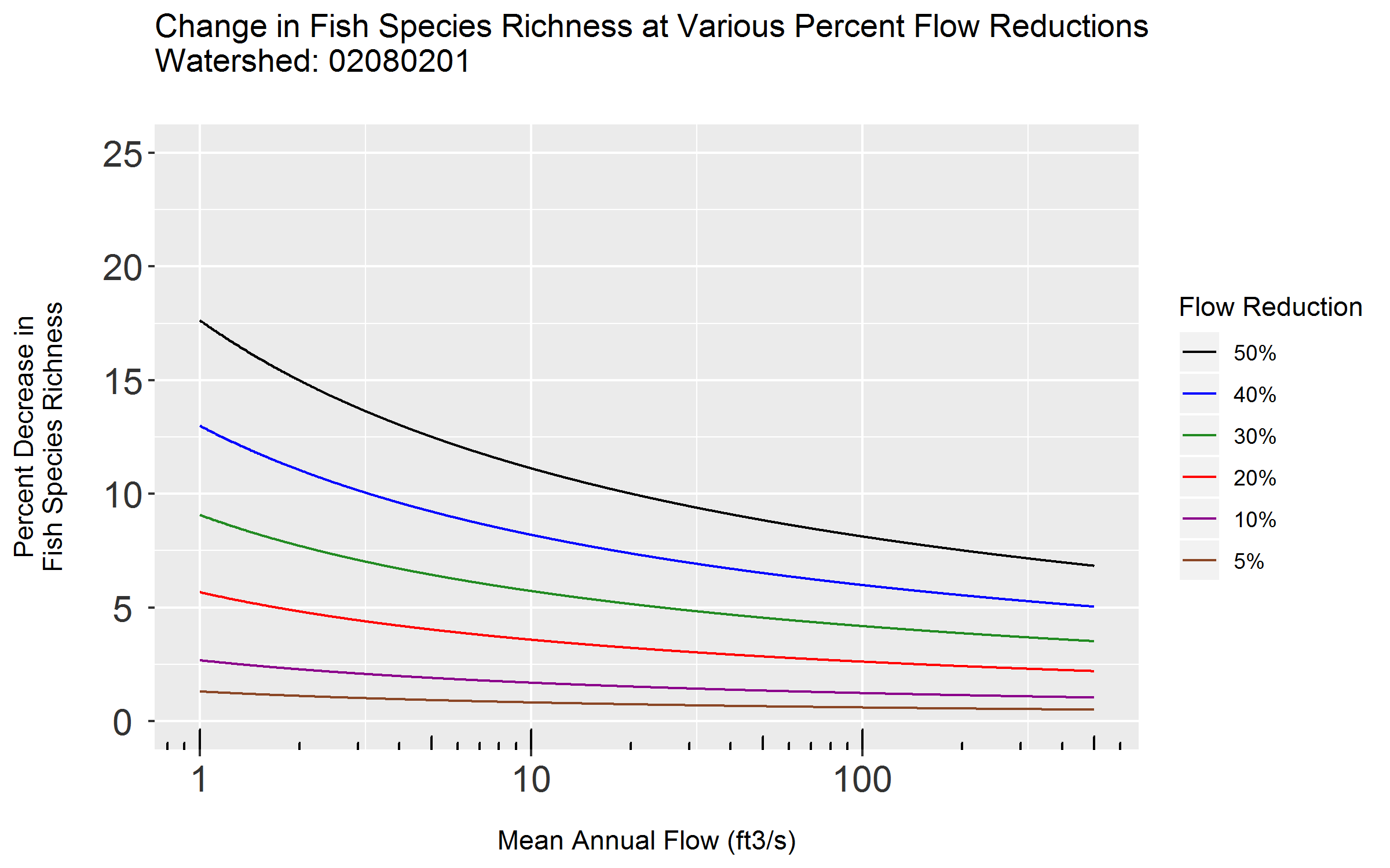 with mean annual flow of 50 cfs)# Calculate absolute richness change (resulting from flow reduction)