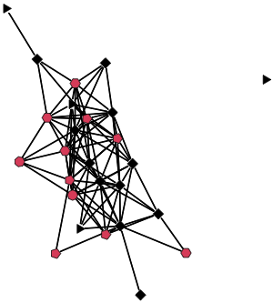 We can make a quick visualization of the network, where the number of sides of the node is proportional to the level of alchol use and the color is black if they do not use alchol and black if they do.