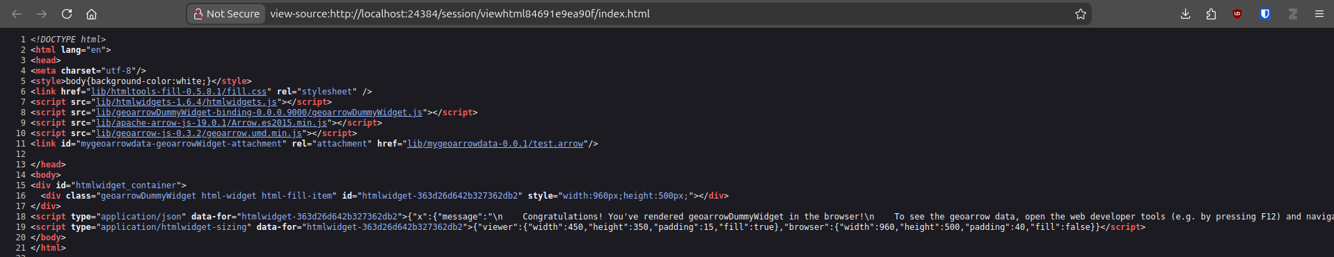 The page source (press <CTRL + u>) will look something like this, where in line 11 you see the attached test.arrow file and above the necessary scripts (arrow and geoarrow JS bindings) to process the data further in JavaScript.