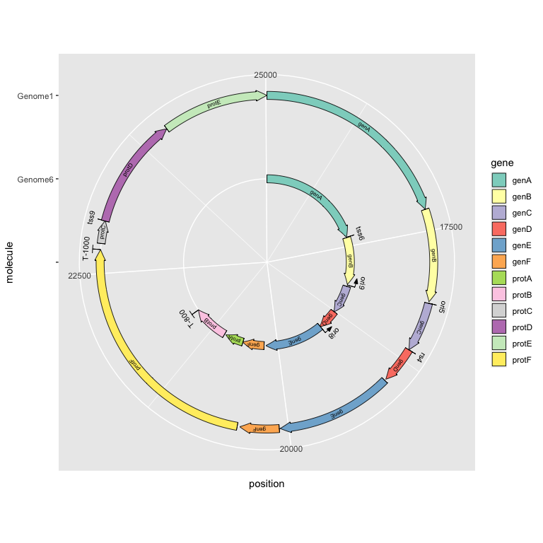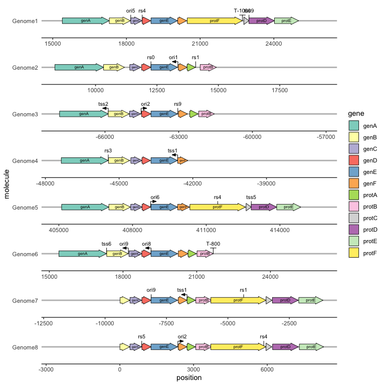 aes(xmin = start, xmax = end, y = molecule, fill = gene, label = gene)
