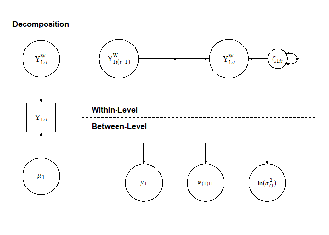 mlts_model_formula(ar1_model)\[ \begin{gathered} \begin{bmatrix} y_{1, it} \\ \end{bmatrix} = \begin{bmatrix} \mu_{1,i} \\ \end{bmatrix} + \begin{bmatrix} y_{1, it}^w \\ \end{bmatrix} \end{gathered} \]