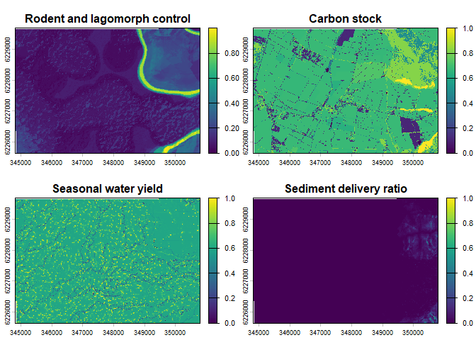 These four raster layers represent the baseline ecosystem-service conditions used by the optimisation model. They define the spatial distribution of the features that are later affected by conservation and restoration actions.