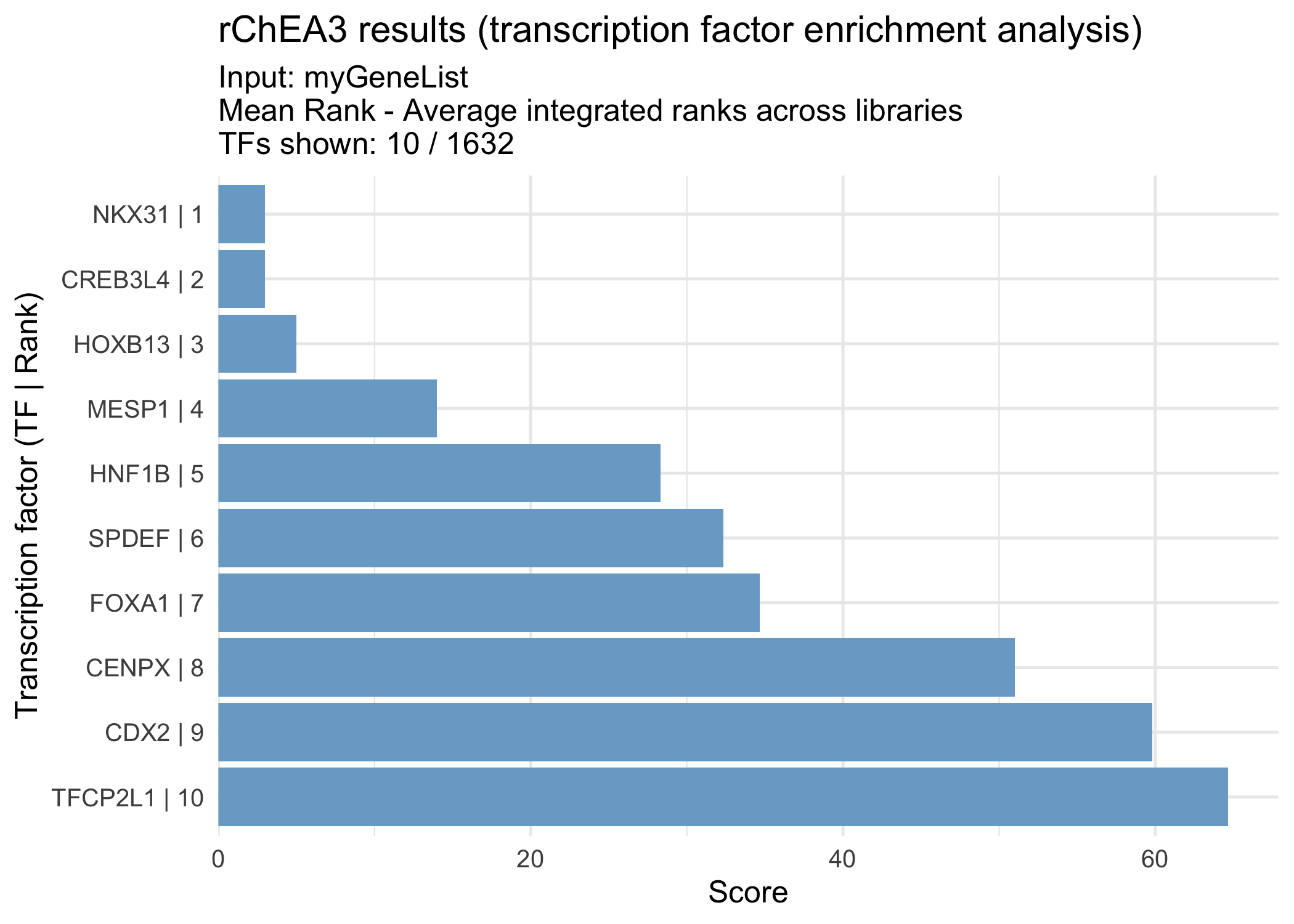 #> 6 AR,TMPRSS2,CYP1B1,KLK3,KLK2This table contains the averaged ranks of transcription factors across all ChEA3 libraries, providing a global view of TF enrichment for your gene set.
