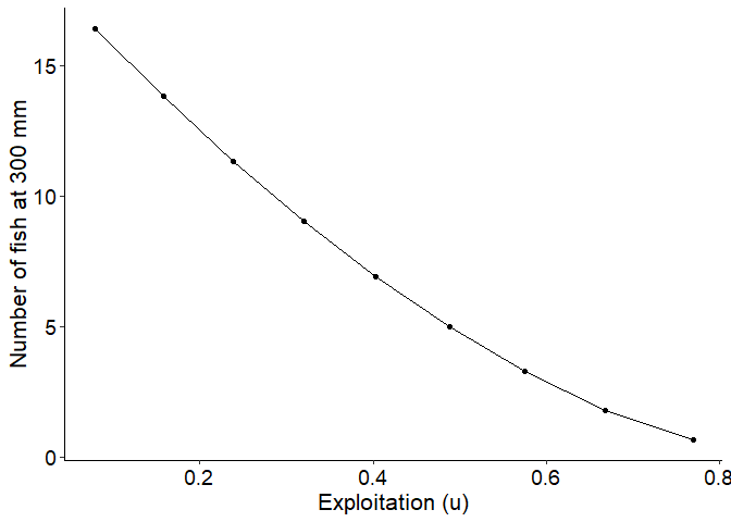 labs(y="Number of fish at 300 mm",x="Exploitation (u)") +