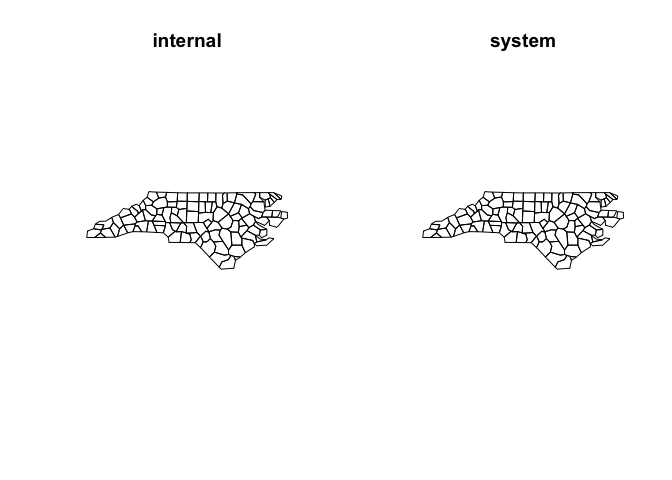 nc_simp_sys <- ms_simplify(nc_sf, sys = TRUE, sys_mem = 8) #sys_mem specifies the amount of memory to use in Gb. It defaults to 8 if omitted.
